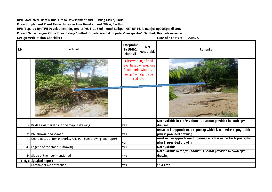 observed HFL did not considered in design calculation and not mentioned in anywhere of design/drawing details. During the site verification process observed HFL found to be 3m above the existing bed level in right abutment side and other major thing is d/n center line of river flow is 2.25m below the existing cause way slab level. Which means minimum height of culvert/bridge will be require 6.75m from the lowest bed level based on existing river flow.