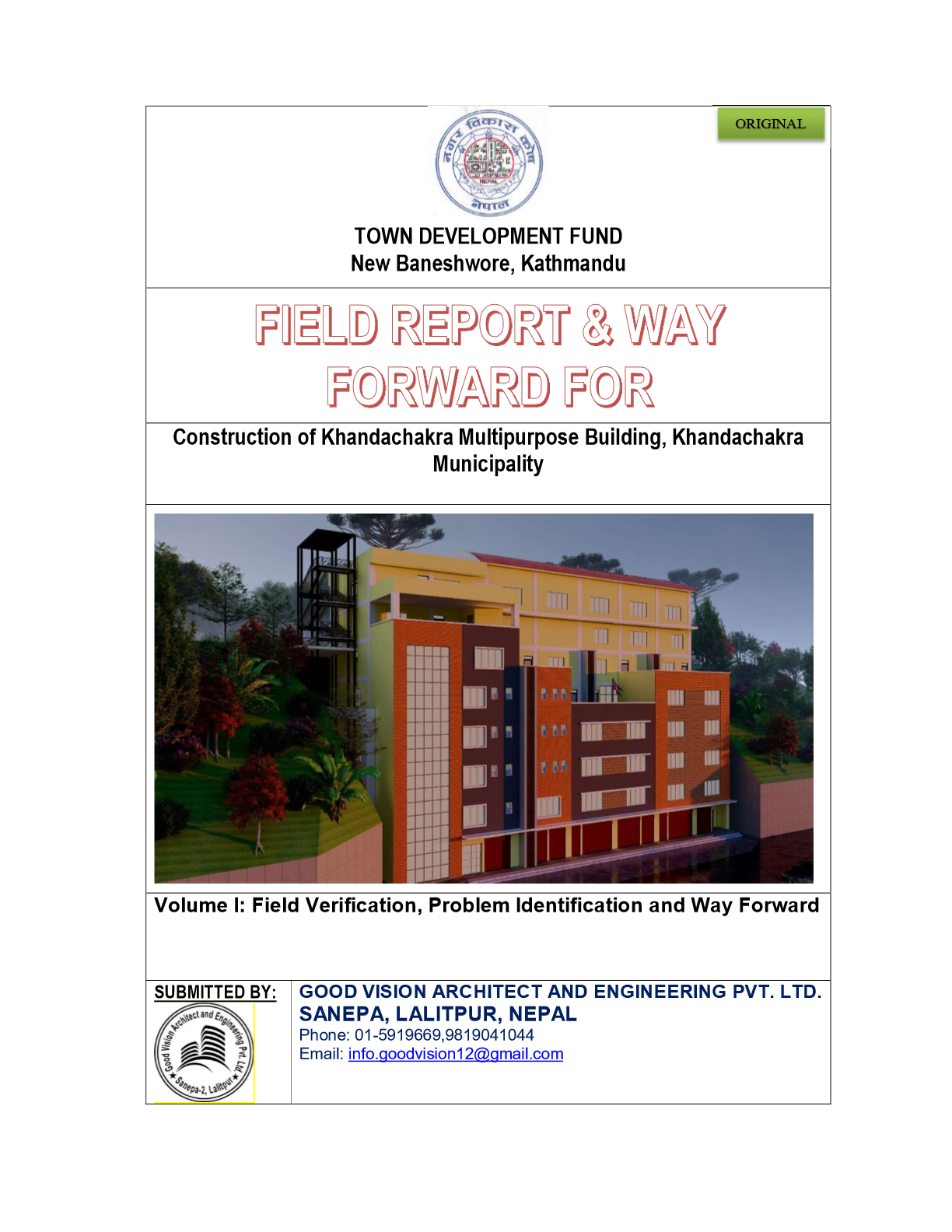 This is the Final Report of Consulting Services for technical support in construction of Khandachakra Multipurpose Building, Khandachakra Municipality, Kalikot. This Report is submitted by Good Vision Architect and Engineering Pvt. Ltd., Lalitpur (hereinafter referred to as the 'consultant) as part of 'Terms of the Contract Agreement' signed with Town Development Fund, Kathmandu (hereinafter referred as a client). The Report contains an Introduction, Problem Identification, Field Verification, Way Forward, Design Activities, and Annexes to complete the assignment. The agreement for the assignment was signed and work commenced with an introductory consultative meeting between the client and consultants at the client's office. The purpose of this consulting service is provide the technical assistance to overcome the challenges observed in the slope protection, soil capacity of building site along with the need to enhance structural analysis measure of Khandachakra Multipurpose Building in Khandachakra Municipality, Manma Bazar, Kalikot. Consultant shall work in close coordination with municipality engineer and is liable to the municipality and TDF.